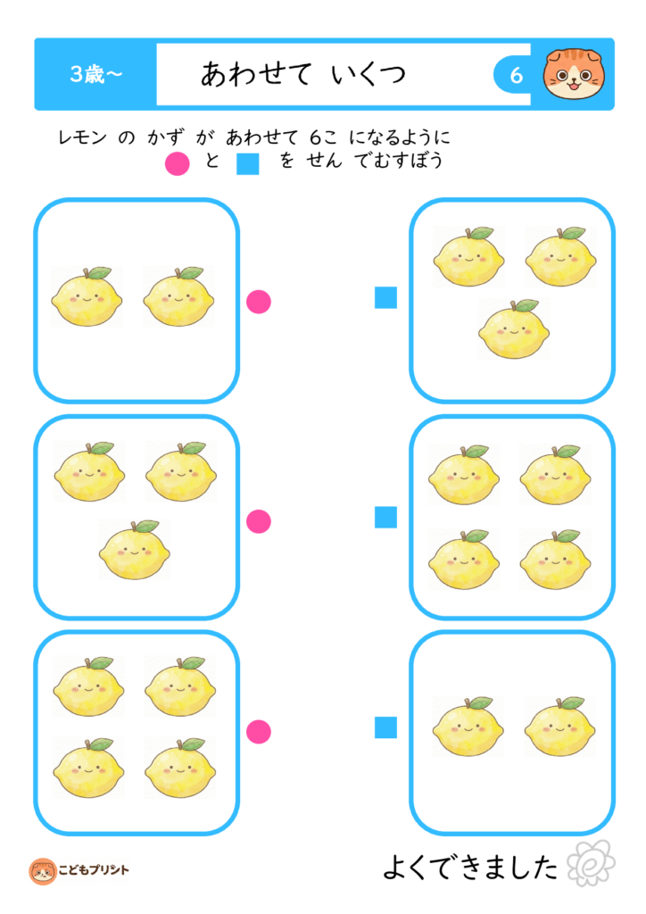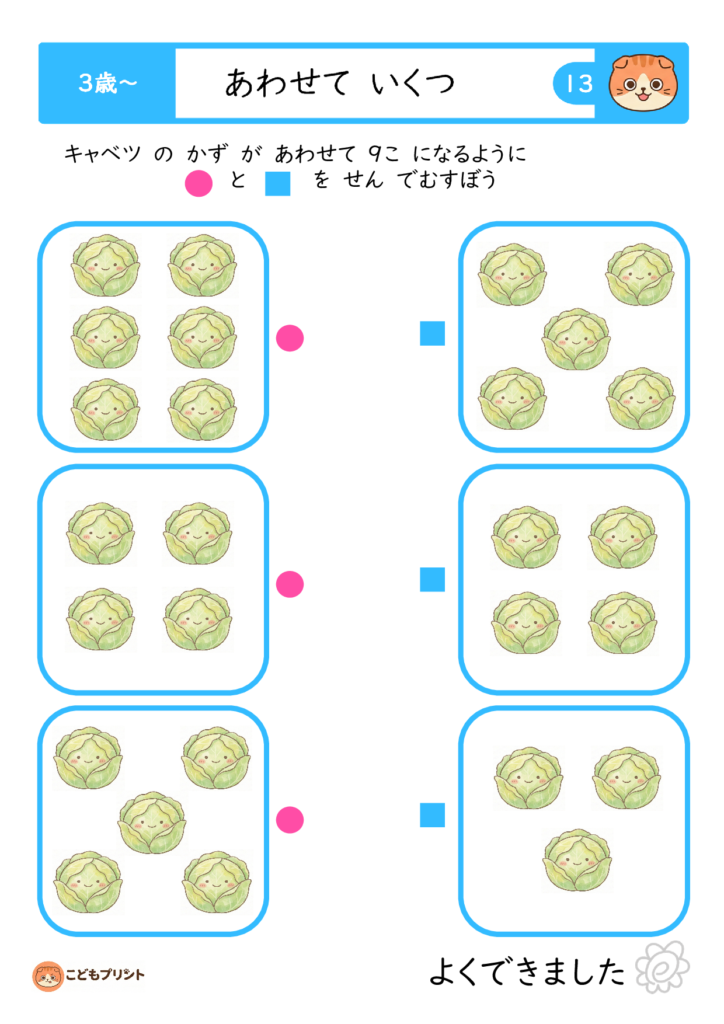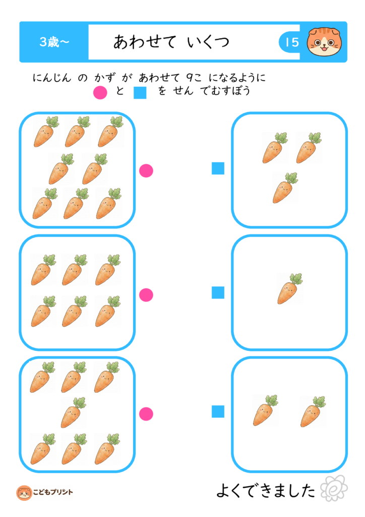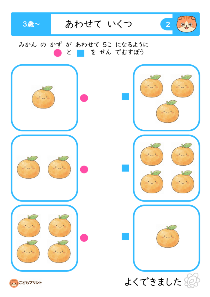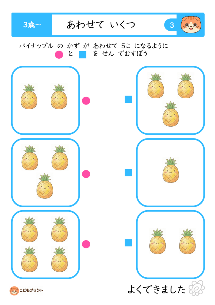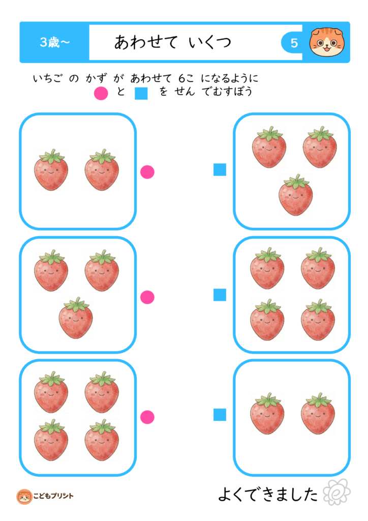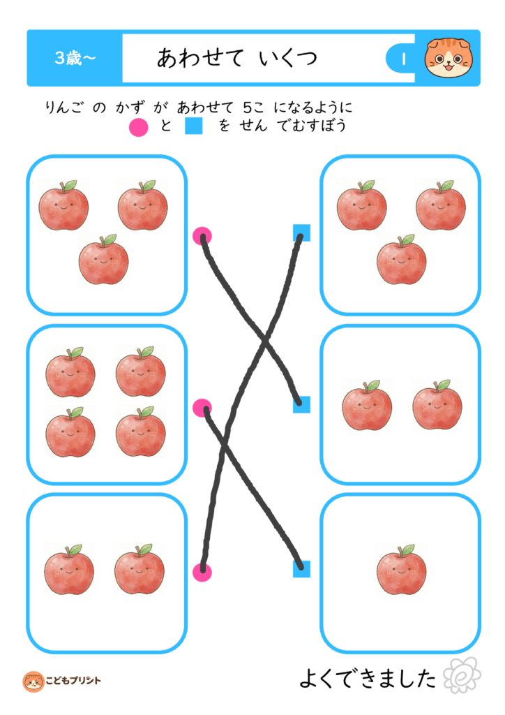 3歳・4歳・5歳向けに幅広い「合わせて5〜9」までのプリントをダウンロードでき、視覚的なイラストと一緒に遊び感覚で学習できるのが魅力。