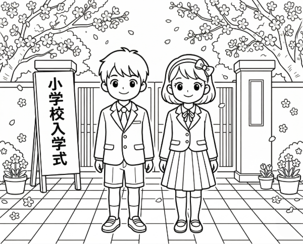 校門の前には「小学校入学式」の看板が立ち、新しい学校生活のはじまりをお祝いしているような場面になっています。ぴかぴかの制服やくつ、やさしく舞うさくらの花びらなど、春らしい雰囲気を感じながら楽しく色をぬってみてください。