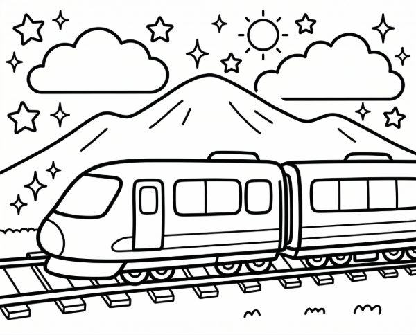 太い輪郭線で描かれているため、小さなお子様がクレヨンではみ出さずに塗る練習(運筆力)をするのにも、高齢者の方が色鉛筆で山の色や空のグラデーションを工夫するのにもぴったりです。太陽があるから「昼の景色」にする?それとも星があるから「夜の景色」にする?お子様の自由な想像力で、世界に一つだけの鉄道の旅を完成させてください。