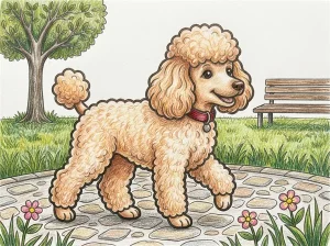 公園のベンチや道、植物のある場面が好きなら、こちらのトイ・プードルのぬりえもおすすめです。犬種は変わりますが、同じ細かい背景つきで見比べながら楽しめます。