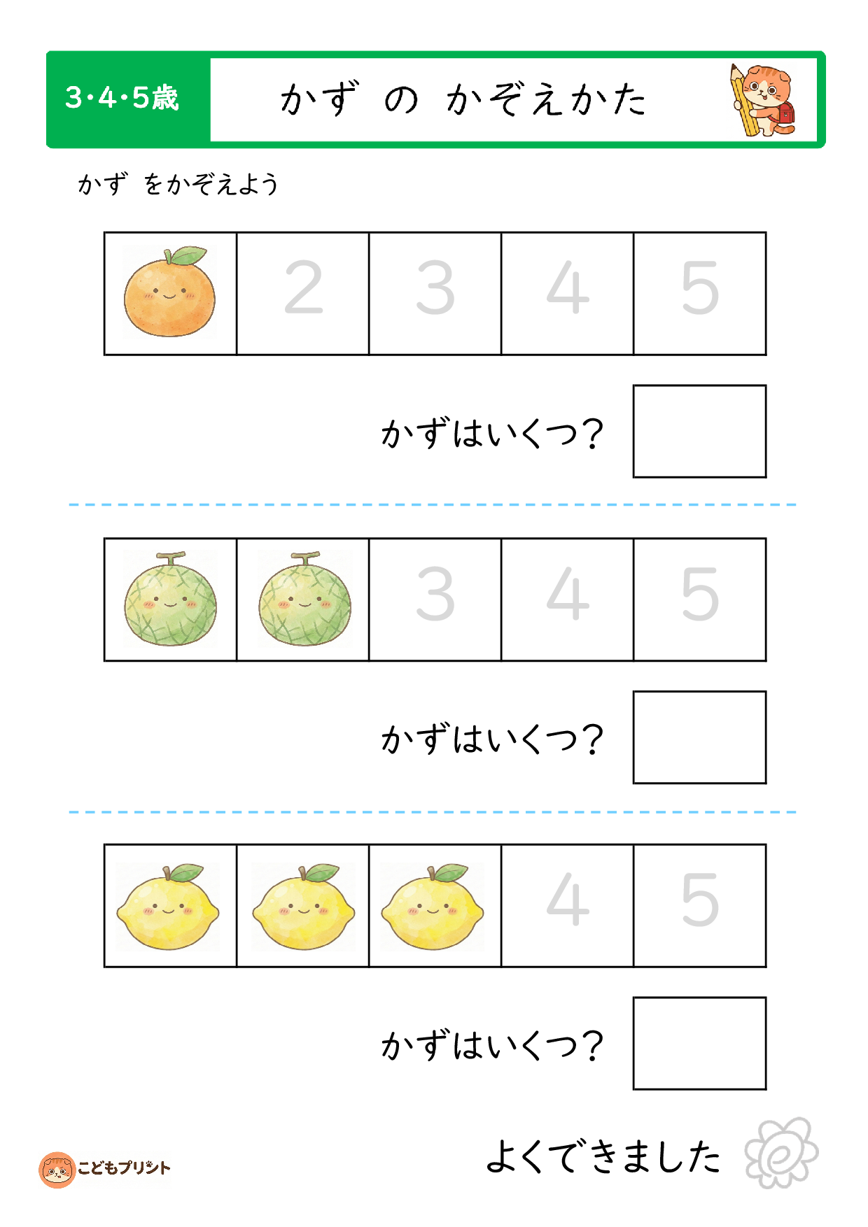 | かずの数え方 | 数の数え方と、あわせていくつ でたしざんの練習を行います。 対象年齢:3~5歳 | ![]() |